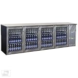 | ✚✚✚ Glastender BB108-R1-XSH(LLLL) 108" Glass Door Back Bar Cooler If your commercial foodservice operation serves cold beverages at the bar a four-door back bar cooler is the best method to ensure that you have plenty of canned and bottled beverages cold and ready to go for your guests. The 108" Glass Door Back Bar Cooler (BB108-R1-XSH(LLLL)) from Glastender offers maximum storage space for canned and bottled beverages; in fact it can hold up to 32 cases of 12 ounce beer bottles or 330 wine bottles (750ml). The glass doors allow customers to view the selection before ordering, speeding up service, and the stainless steel top ensures that this model can handle the tough conditions of commercial bar environments. Keep beverages cold and the profits flowing with this self-contained back bar cooler. Features: Stainless steel die-cast handles, Self-contained back bar cooler, 1/2" thick ABS plastic threshold, CFC free foamed-in-place insulation, Automatic condensate evaporator and defrost timer, Stainless steel top with black vinyl-clad steel exterior front and sides, Left door hinged left, center-left door hinged left, center-right door hinged left and right door hinged left. Benefits: 180° swinging doors for improved access, Leg sockets recessed into base for improved durability, Six foot grounded cord and plug exits at rear for effortless installation, Stainless steel adjustable bullet feet ensure level installation on uneven floors, Stainless steel interior construction with radius interior corners for easy cleaning.