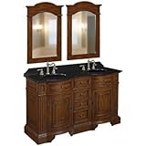| ✚✚✚ 60" Double Basin Vanity in Dark Cherry 80052R Features: -Double basin vanity.-Black granite top and backsplash.-Four functional drawers and two faux drawers.-Doors open to storage compartment.-Pre drilled on 8" centers.-Single mirror.-Wall mounted mirror. Includes: -Includes two undermount black porcelain basin.-Includes antique brass cabinet hardware. Color/Finish: -Dark cherry finish. Dimensions: -Overall dimensions: 36" H x 60" W x 22" D.-Overall dimensions: 36" H x 24" W x 2" D.