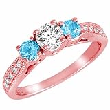 | ✚✚✚ 18K Rose Gold Round 3 Stone Diamond and Blue Topaz Ring With Milgrain Pave Set Shank (0.95 ctw) Siz This dazzling sparkling timeless ring is classic and can be used as an engagement ring, anniversary ring, bridal ring, promise ring, proposal ring, fashion ring, wedding ring, cocktail ring and also to represent eternal love between you and that special someone. This 18K rose gold diamond ring is prong set with 1 round diamond and 2 round Blue Topaz gemstones. There also also 10 sparkly diamonds on the shank of this ring (5 on each side). The total carat weight of all the stones are approximately 0.95 carats. The diamonds are H-I color and SI-I2 clarity. The ring band measures approximately 1.80 mm wide and 1.0 mm thick.